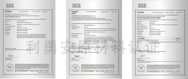 我們的硅膠原材料都經(jīng)過了國際認證標準,認證報告分別有(ROHS、鹵素、PAHS、REACH、FDA、LFGB、MSDS、USP、NSF、UL黃卡等)。
