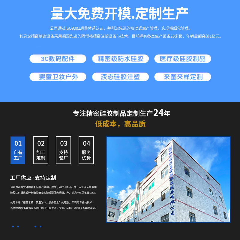利勇安硅膠始終堅(jiān)持誠(chéng)信務(wù)實(shí)的工作態(tài)度,專注技術(shù)創(chuàng)新與品質(zhì)提升致力于打造高質(zhì)量硅膠產(chǎn)品,持續(xù)深耕汽車、智能穿戴、母嬰用品、3C電子、醫(yī)療行業(yè)與電子霧化等多個(gè)領(lǐng)域。專注液態(tài)硅膠制品精密技術(shù)研發(fā)24年。